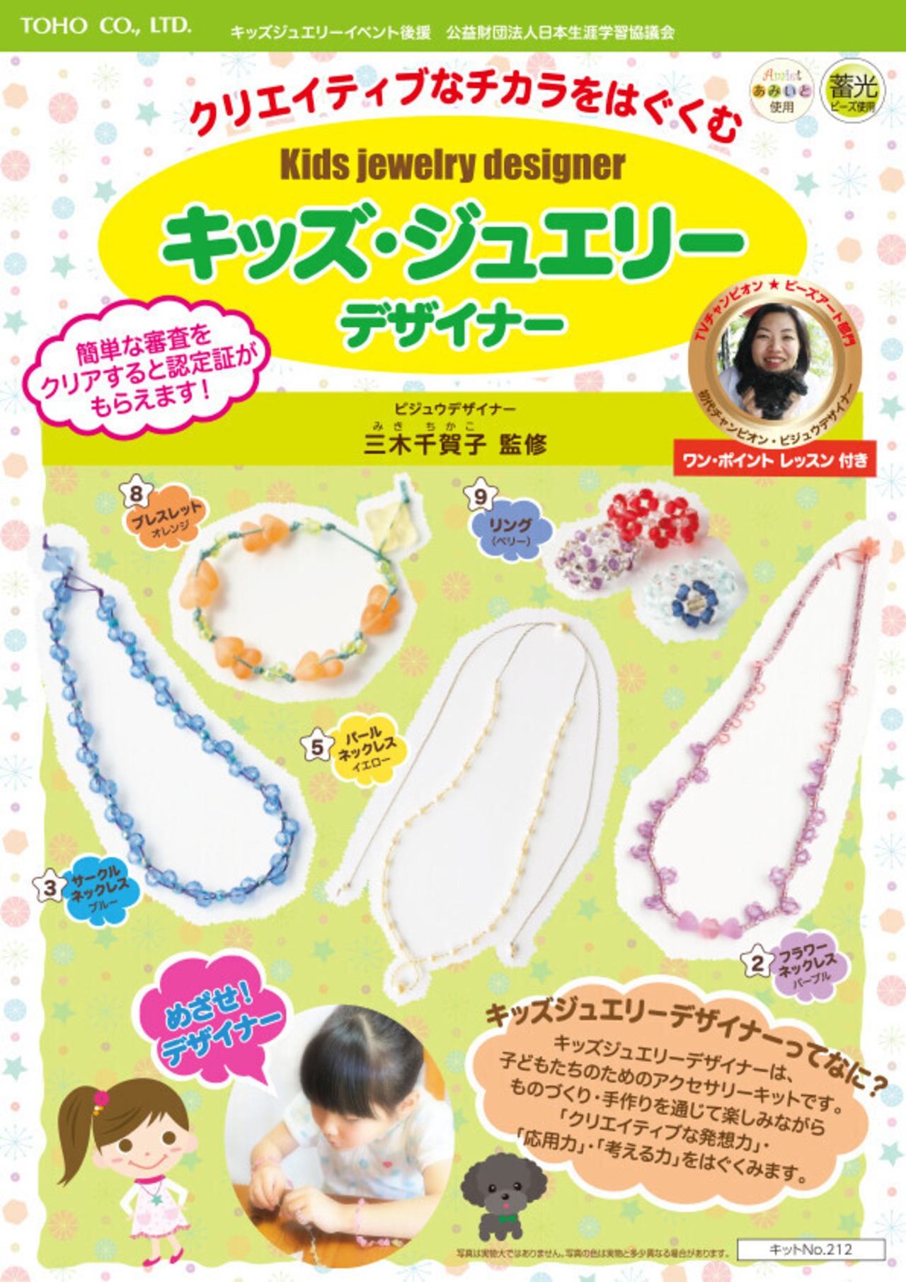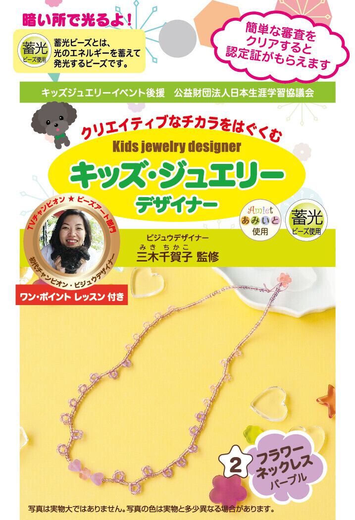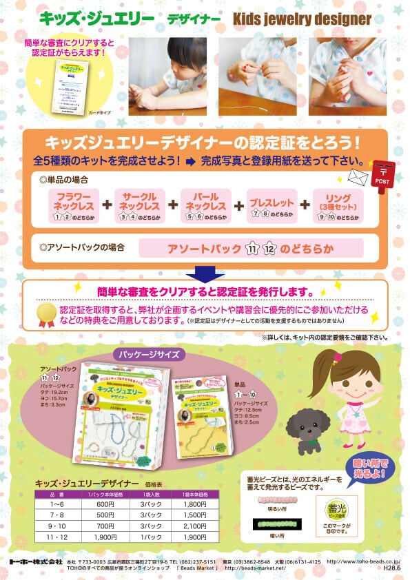 色違いを含め10種類あるアクセサリーは、紐の交差や結びなど色々な技法で作られるため、手作りを通じて楽しみながら「クリエイティブな発想力」「応用力」「考える力」を育むキットです。またキッズジュエリーデァイナーの種類の違う5種類を作り完成写真と登録用紙を送って頂き、簡単な審査をクリアすると認定証を発行します。