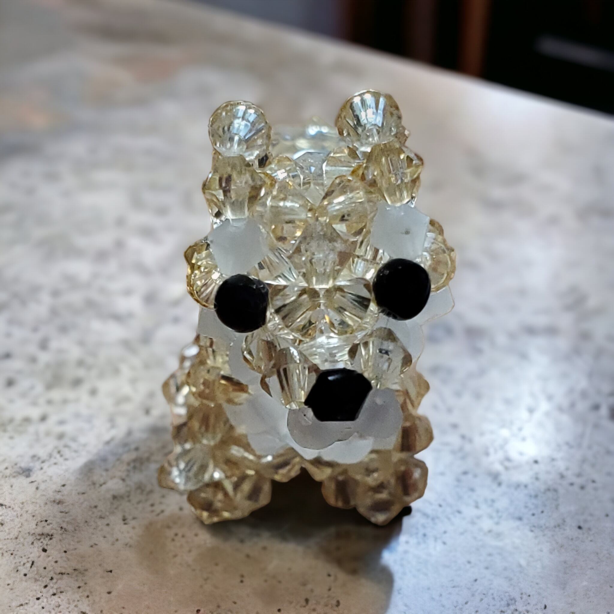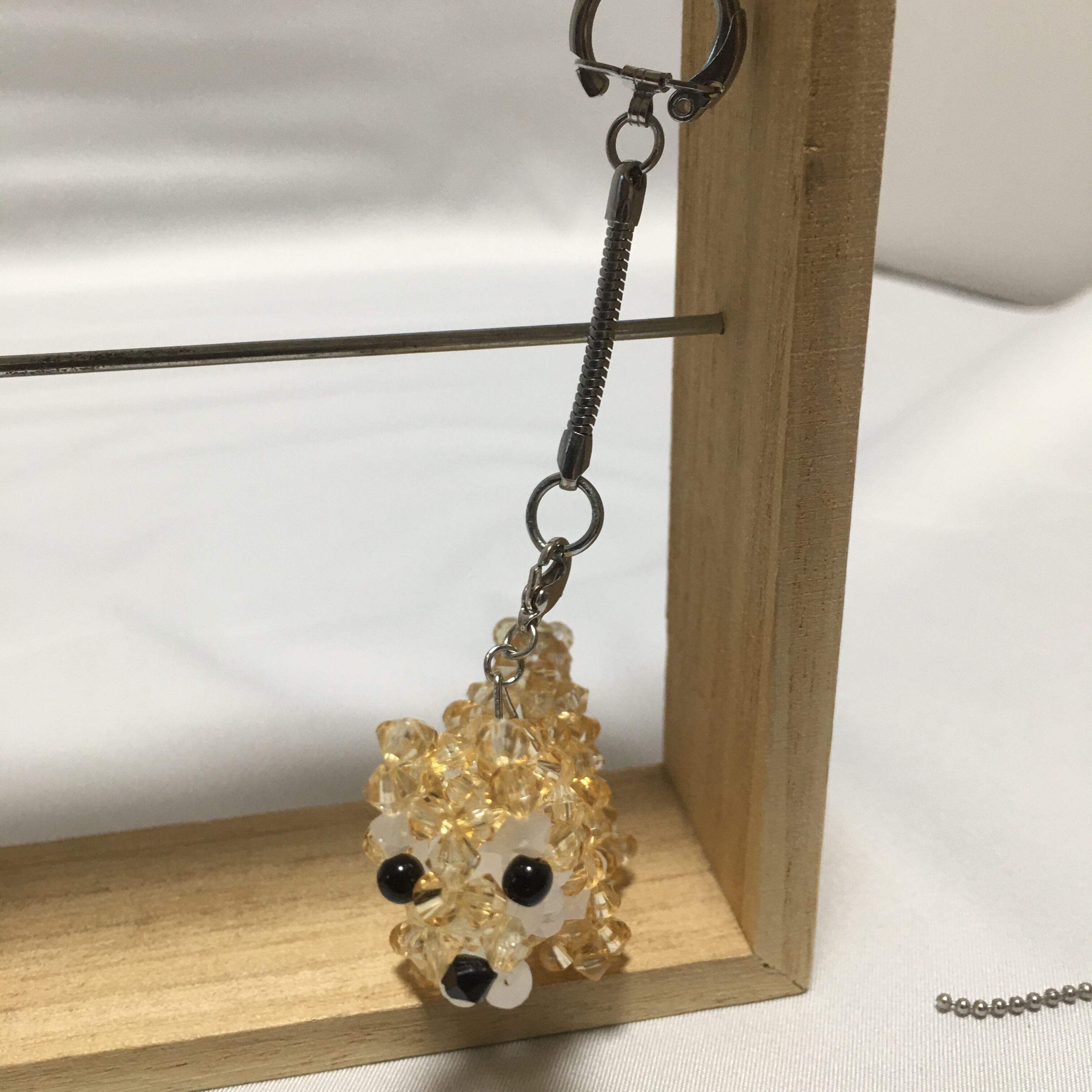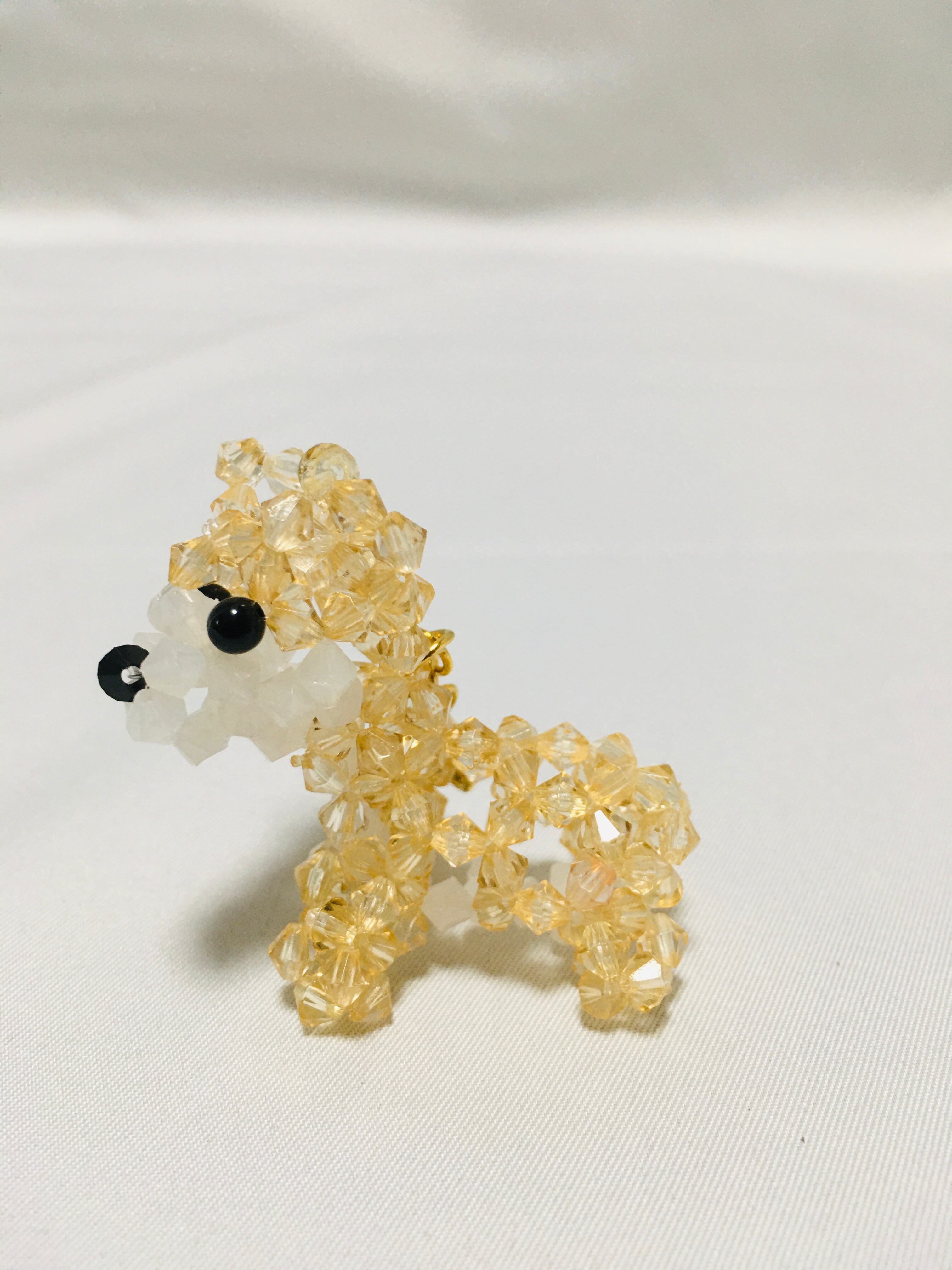 テグスにアクリルビーズを通して手作りしています。このシバイヌのモチーフアクセサリーは、ライトトパーズ色のアクリルビーズを使って作られた、とても可愛らしいデザインが特徴です。アクリルビーズは、軽量で丈夫な素材なので、長時間の着用でも疲れにくく、気軽にお使いいただけます。また、手作りのアクセサリーならではの温かみが感じられる、1つ1つ丁寧に結び上げられた犬のモチーフは、オリジナリティあふれるアクセサリーとなっています。