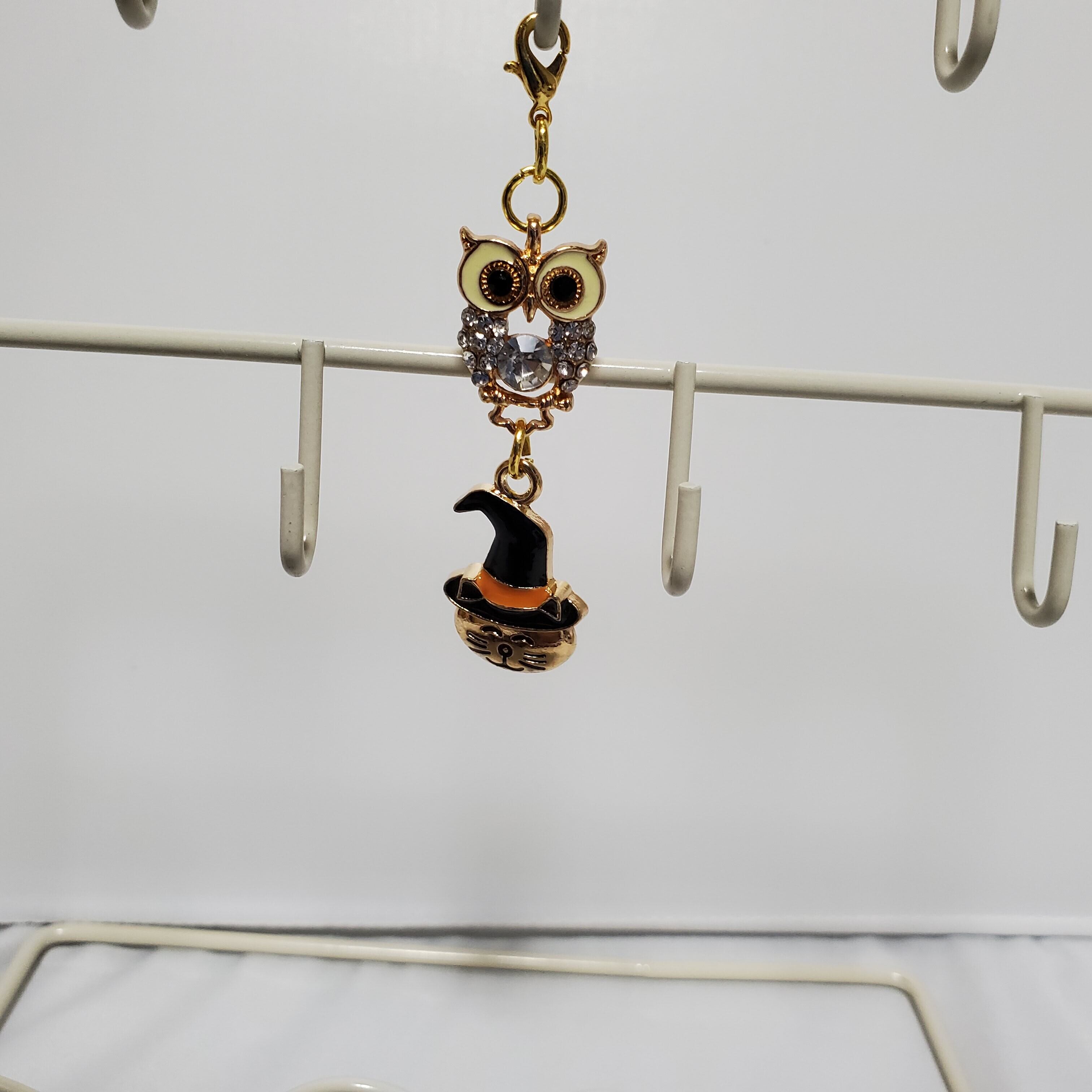 ハロウインのフクロウと猫のチャームをリボンに付けてネックレスにしました。