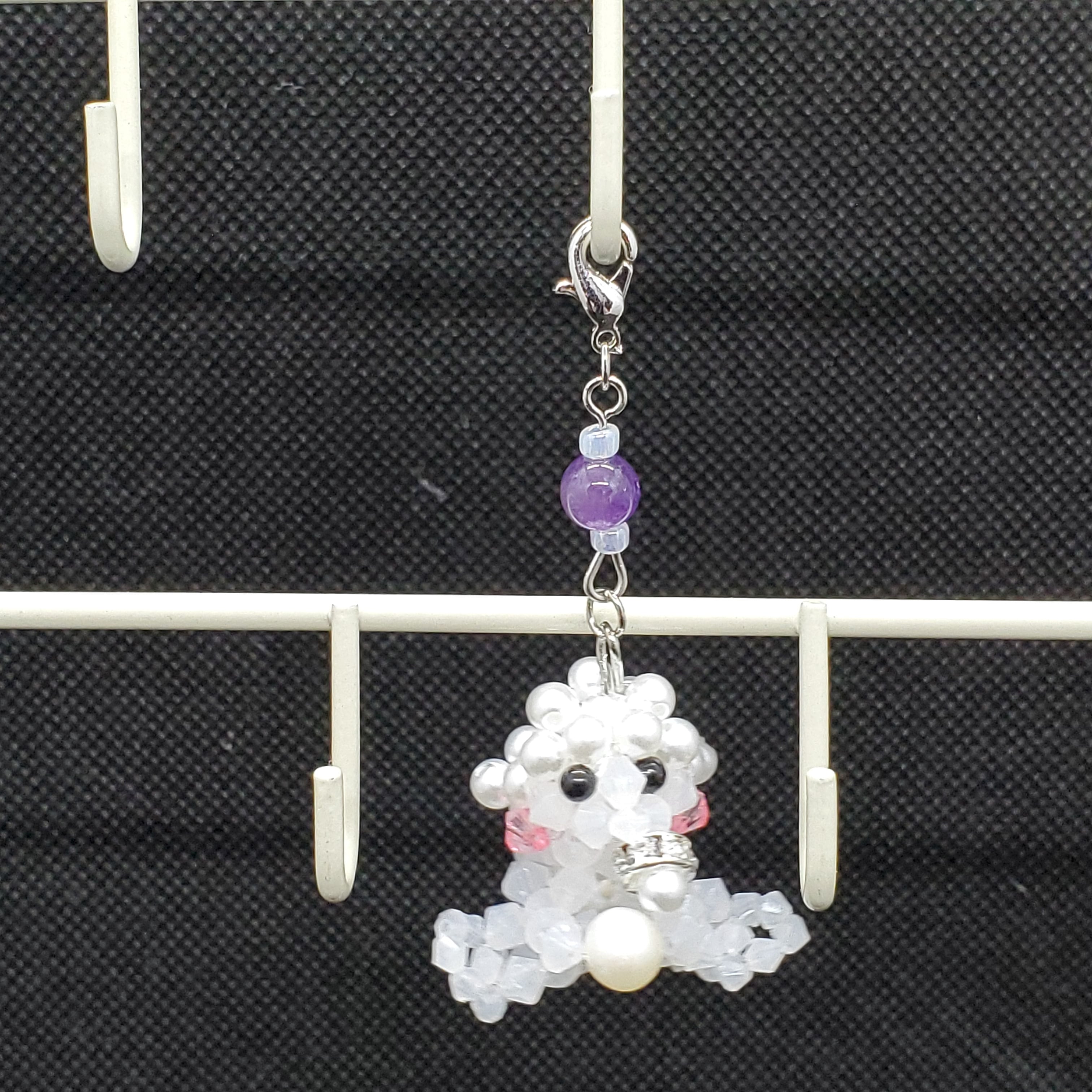 このアクセサリーは、シルバニアファミリーのヒツジの赤ちゃんをモチーフにした、手軽に持ち運べるアクセサリーです。可愛らしい赤ちゃんが、両手に6月の誕生石である「淡水パール」を持っています。淡水パールは、悪霊から身を守って邪気を払い、想像力を高めると、伝承されています。チャームの部分には、2月の誕生石である「アメジスト」をつけています。アメジストは、邪悪なものを払い除け、真実の愛を守り、絆を深めると、伝承されています。2つの天然石で自然の癒しの力を活用するような組み合わせのアクセサリーになっています。