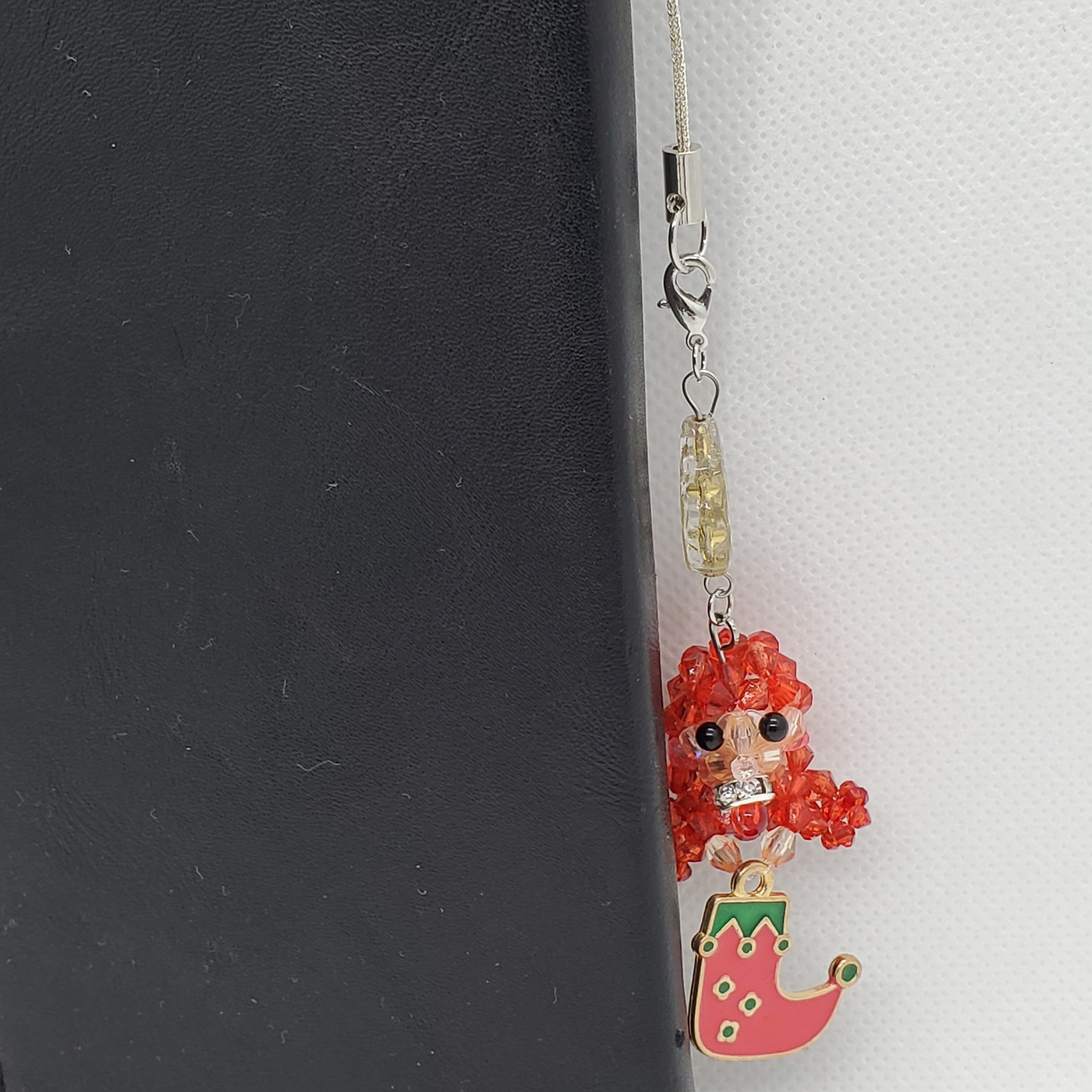 このアクセサリーは、赤い靴下のチャームを持つ赤ちゃんのサンタクロースをビーズモチーフにした、クリスマスにぴったりの癒しアイテムです。頭には、透明色のクリスマスツリーのチャームをあしらい、クリスマスの雰囲気を盛り上げます。
